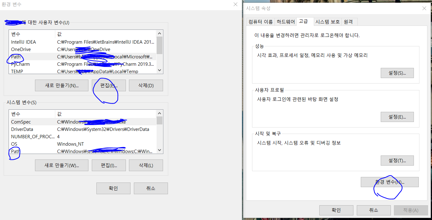 윈도우 검색창에서 시스템 환경변수 편집을 열어준다.